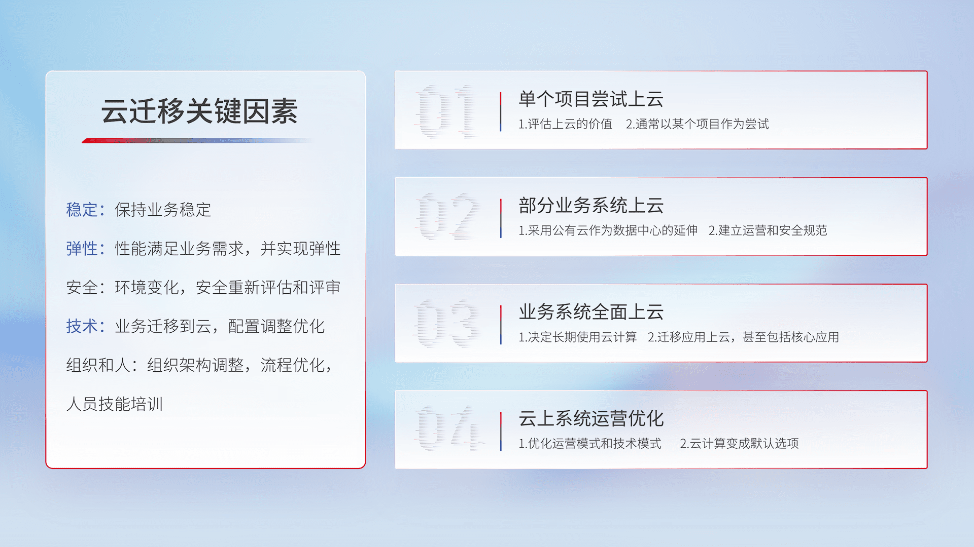 结合实际业务,,从规划设计、、、云平台选型、、、云原生改造、、、数据迁移、、、集成交付,,,,迁移全过程为客户识别最佳上云路径,,,,做好风险识别管理,,,,设计网络架构、、、身份权限、、、安全审计合规、、操作审计、、日志审计、、、、监控告警策略、、、多站点容灾设计等,,,,对云上基础设施进行整体规划,,,提升IT治理水平,,,,以满足弹性、、、、高可用、、、高性能的需求。。。